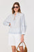 Romantic volume and breezy stripes define this peasant blouse with ruffled collar and tie details. Embroidered scalloped trim adds delicate finishing touches to the billowy sleeves and relaxed silhouette.