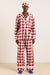 An oversized burgundy gingham adorns our Antonella pyjama set, featuring a classic button up shirt, tie waist detailing and frill trims. Complete with fabric storage bag.