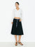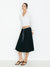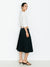 Double waistband contrast pleated skirt in navy. This A-line midi skirt features a distinctive double waistband and contrast colour detailing. Finished with crisp pleats for added structure and movement, it’s a modern twist on a classic silhouette. The fabric composition is 97% polyester 3% spandex, with a 100% Polyester Lining.