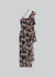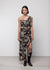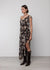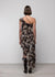 Fitted midi-length dress with an asymmetrical hem and a semi-sheer finish. Designed with a striking Burnt Blossom Print, it blends elegance and modernity effortlessly.