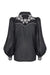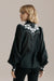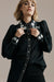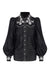 Cut in inky black and traced with contrast piping, she is adorned with hand embroidered blooms at the collar and cuffs, each one a testament to craftsmanship, stitched with artistry.